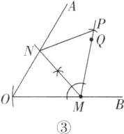 如图③,连接 MQ 并延长,以点 M 为圆心,以 MO 的长度为半径画弧,交射线 MQ 于点 P,以点 M 为圆心,一定长度为半径画弧,交 MO,MP 于两点,分别以这两点为圆心,大于这两点距离的一半长度为半径画弧,两弧交于一点,过点 M 和两弧的交点作射线,交 OA 于点 N,连接 NP,四边形 OMPN 即为所求.