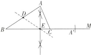 解析:延长 BC,以点 C 为圆心,AC 长为半径画弧交 BC 的延长线于点 A',作线段 A'B 的垂直平分线,交 BC 于点 E,连接 DE,点 E 为所求.根据作图可知,AC = CA',BE = EA',BD = AD,所以 BE + BD = EA' + AD = EC + AC + AD,即直线 ED 平分△ABC 的周长.