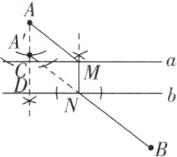 作法如下:过点 A 作直线 AC⊥a,交直线 a 于点 C,交直线 b 于点 D,在线段 AD 上截取 AA' = CD,连接 A'B 交直线 b 于点 N,过点 N 作 MN⊥b 交直线 a 于点 M,管道的位置 A→M→N→B 即为所求.