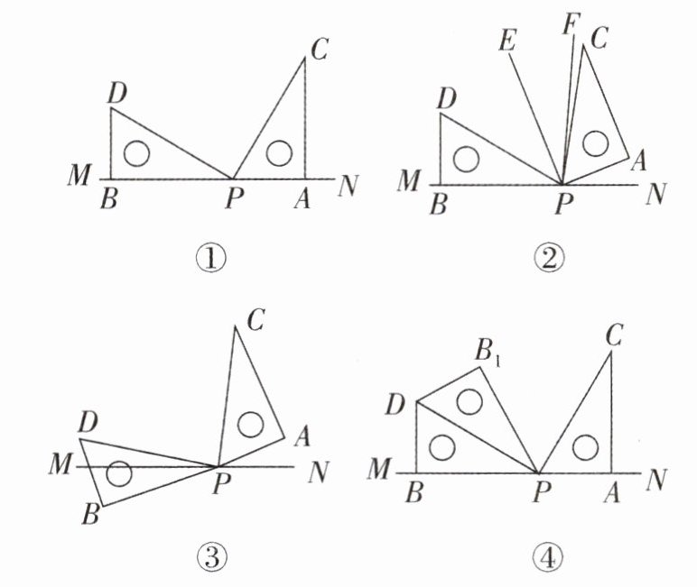 在数学实践课上,给出两个大小、形状完全相同的含有 30°,60°的直角三角板按如图①放置,PA,PB 在直线 MN 上,且三角板 PAC 和三角板 PBD 均可以点 P 为顶点运动.