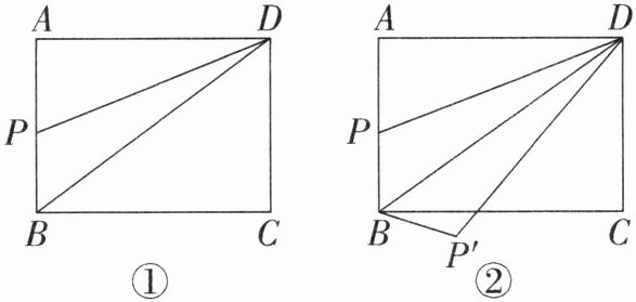 (3)如图②,当点 $ P $ 不与点 $ B $ 重合时,作点 $ P $ 关于 $ BD $ 的对称点 $ P'$,分别连接 $ BP'$,$ DP'$。