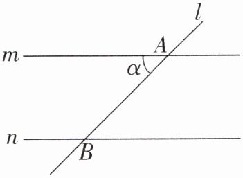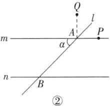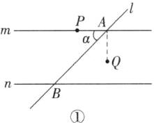 1. 如图,平行线 $ m$,$ n$ 间的距离为 $ 5$,直线 $ l$ 与 $ m$,$ n$ 分别交于点 $ A$,$ B$,$α = 45^{\circ}$,在 $ m$ 上取点 $ P$(不与点 $ A$ 重合),作点 $ P$ 关于直线 $ l$ 的对称点 $ Q$。若 $ PA = 3$,则点 $ Q$ 到直线 $ n$ 的距离为 (