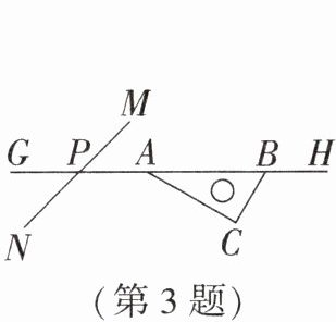 3. (2025·吉安校级月考)将一个三角板如图所示摆放,直线 $ MN $ 与直线 $ GH $ 相交于点 $ P$,$∠ MPH = 45^{\circ}$,$∠ C = 90^{\circ}$,$∠ CAB = 30^{\circ}$,现将三角板 $ ABC $ 绕点 $ A $ 以每秒 $ 3^{\circ}$ 的速度顺时针旋转,设旋转时间为 $ t $ 秒,且 $ 0 ≤ t ≤ 60$,当 $ t =$