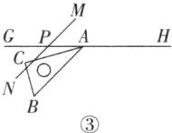 如图②,当AC//MN时,∠PAC = ∠MPH = 45°,所以∠CAH = 180° - ∠PAC = 135°,所以∠BAH = ∠CAH - ∠CAB = 105°,即旋转角度是105°,所以t = 105÷3 = 35(秒);