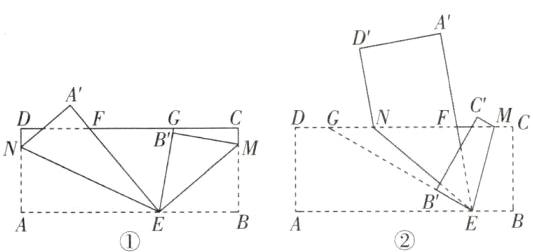 当点G在点F的左侧时,如图②,由折叠的性质得∠NEF = $\frac{1}{2}$∠AEF,∠MEG = $\frac{1}{2}$∠BEG,所以∠NEF + ∠MEG = $\frac{1}{2}$∠AEF + $\frac{1}{2}$∠BEG = $\frac{1}{2}$(∠AEF + ∠BEG) = $\frac{1}{2}$(180° + ∠FEG).又因为∠FEG = 50°,所以∠NEF + ∠MEG = $\frac{1}{2}$×(180° + 50°) = 115°,所以∠MEN = ∠NEF + ∠MEG - ∠FEG = 115° - 50° = 65°.综上,∠MEN的度数为65°或115°.