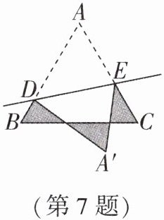 答案:7. D 解析:因为 $ △ A B C $ 是边长为 1 的等边三角形,所以 $ A B = B C = C A = 1 $,因为 $ D $,$ E $ 分别是边 $ A B $,$ A C $ 上的两点,将 $ △ A D E $ 沿直线 $ D E $ 折叠,点 $ A $ 落在 $ A ^ { \prime } $ 处,所以 $ A D = A ^ { \prime } D $,$ A E = A ^ { \prime } E $,则阴影部分图形的周长为 $ B C + B D + C E + A ^ { \prime } D + A ^ { \prime } E = B C + B D + C E + A D + A E = B C + A B + A C = 3 $,故选 D.