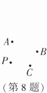 8. C 解析:如图,根据题意,点 $ A $ 是点 $ P $ 与点 $ P _ { 1 } $ 的中点;点 $ B $ 是点 $ P _ { 1 } $ 与点 $ P _ { 2 } $ 的中点;点 $ C $ 是点 $ P _ { 2 } $ 与点 $ P _ { 3 } $ 的中点……以此类推,跳至第 5 步时,所处位置与点 $ P $ 关于点 $ C $ 对称,故再跳一步,可以回到原处点 $ P $. 所以至少要跳 6 步回到原处点 $ P $. 故选 C.