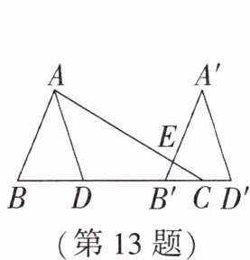 .答案:13. $ 80 ^ { \circ } $ 解析:由平移的性质可得 $ ∠ B A D = ∠ A ^ { \prime } = 40 ^ { \circ } $,$ A ^ { \prime } B ^ { \prime } // A B $. 因为 $ A D $ 平分 $ ∠ B A C $,所以 $ ∠ B A C = 2 ∠ B A D = 80 ^ { \circ } $. 因为 $ A ^ { \prime } B ^ { \prime } // A B $,所以 $ ∠ B ^ { \prime } E C = ∠ B A C = 80 ^ { \circ } $.