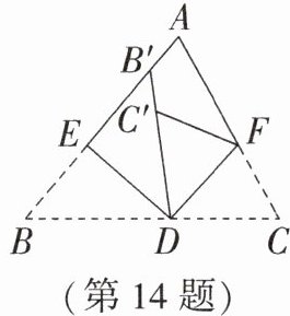 °.答案:14. 70 解析:由折叠的性质可得 $ ∠ B E D = ∠ B ^ { \prime } E D $,因为 $ ∠ B E D + ∠ B ^ { \prime } E D = 180 ^ { \circ } $,所以 $ ∠ B E D = ∠ B ^ { \prime } E D = 90 ^ { \circ } $,所以 $ ∠ E D F + ∠ B ^ { \prime } E D = 180 ^ { \circ } $,所以 $ A B // D F $,所以 $ ∠ C F D = ∠ A = 70 ^ { \circ } $.