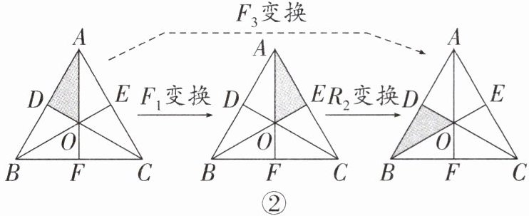 例如,图②中将△ADO作F₁⊕R₂变换,即将△ADO先作F₁变换得△AEO,再将△AEO作R₂变换,得到△BDO.而将△ADO直接作F₃变换也得到△BDO,这意味着F₁⊕R₂变换可化简为F₃变换,即F₁⊕R₂ = F₃.