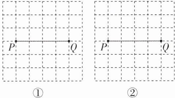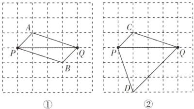 (2)在图②中画出一个四边形PCQD,使其是轴对称图形但不是中心对称图形,且另一条对角线CD由线段PQ以某一格点为旋转中心旋转得到.