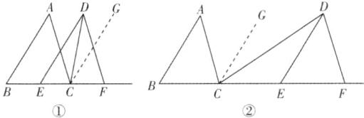 第二种情况:当点$E$在$△ABC$外面时,如图②,过点$C$作$CG// AB$。因为$△DEF$由$△ABC$平移得到,所以$AB// DE$。因为$CG// AB$,$AB// DE$,所以$CG// DE$。①当$∠ACD = 2∠CDE$时,设$∠CDE = x$,则$∠ACD = 2x$,所以$∠ACG = ∠BAC = 45^{\circ}$,$∠DCG = ∠CDE = x$。因为$∠ACD = ∠ACG + ∠DCG$,所以$2x = x + 45^{\circ}$,解得$x = 45^{\circ}$,所以$∠CDE = 45^{\circ}$;②当$∠CDE = 2∠ACD$时,由图可知,$∠CDE < ∠ACD$,故不存在这种情况。综上,$∠CDE = 30^{\circ}$或$15^{\circ}$或$45^{\circ}$。