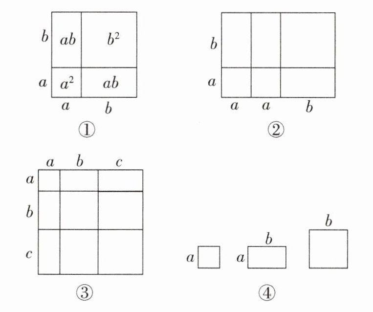 (3)如图④,若用其中 $x$ 张边长为 $a$ 的正方形,$y$ 张边长为 $b$ 的正方形,$z$ 张边长分别为 $a$,$b$ 的长方形纸片拼出一个面积为 $(2a + b)·(a + 2b)$ 的长方形(无空隙、无重叠地拼接),则 $x + y + z=$.