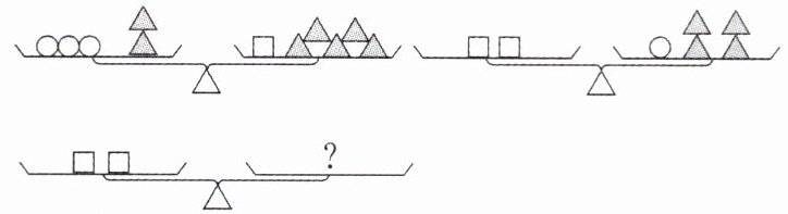 答案:7. B 解析:根据题意,设圆形为x,三角形为y,正方形为z,所以$\{\begin{array}{l} 3x+2y=z+5y,①\\ 2z=x+4y,②\end{array} $所以由①得,z=3x−3y ③,把③代入②,得2(3x−3y)=x+4y,整理得x=2y,所以2z=2y+4y=6y,所以应放△的数量为6个,故选B.