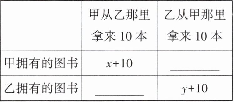 (1)设甲原来有x本图书,乙原来有y本图书,完成表格: