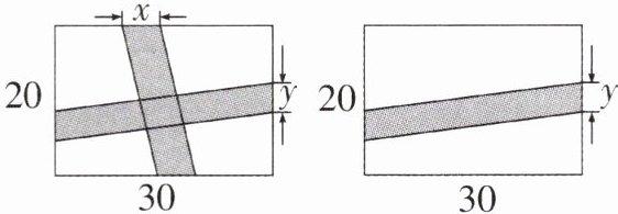 7. 如图所示,在长为 30 米、宽为 20 米的长方形花园里,原有两条面积相等的小路,其余部分为绿地.现在为了增加绿地面积,把公园里的一条小路改为绿地,只保留另一条小路,并且使得绿地面积是小路面积的 4 倍,则 x 与 y 的值分别为 (