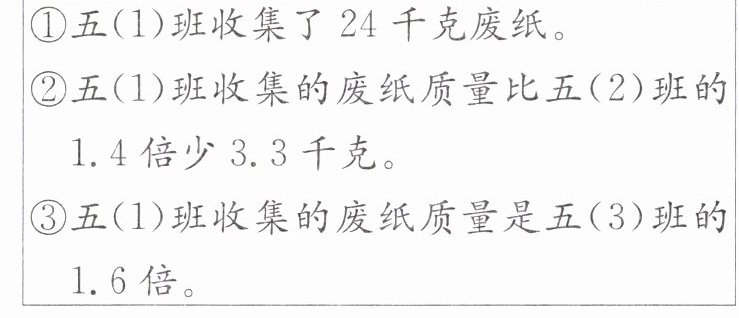 【提示】根据题意可知,五(2)班收集的废纸质量 $ ×1.4 - 3.3 = $五(1)班收集的废纸质量,据此列方程求解即可。