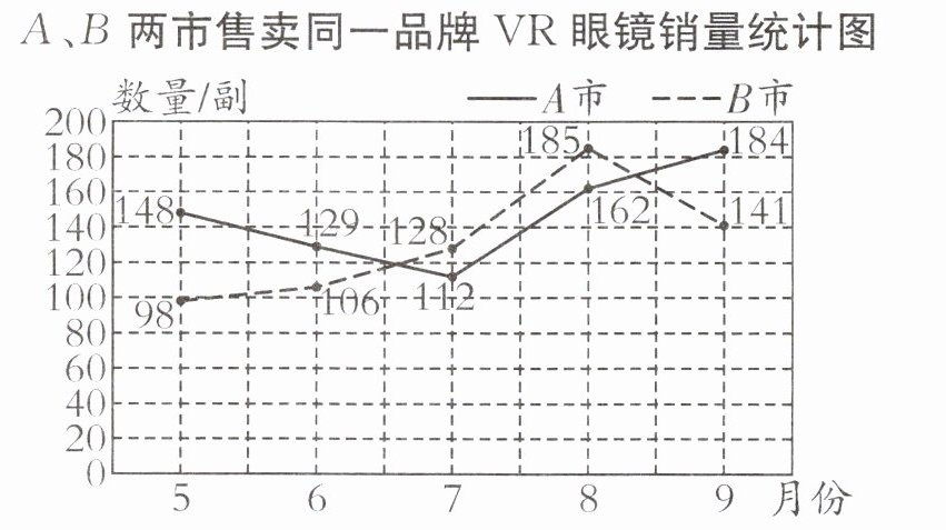 (1)根据统计图说明 $ A $、$ B $ 两市该品牌 VR 眼镜售卖量的变化情况。