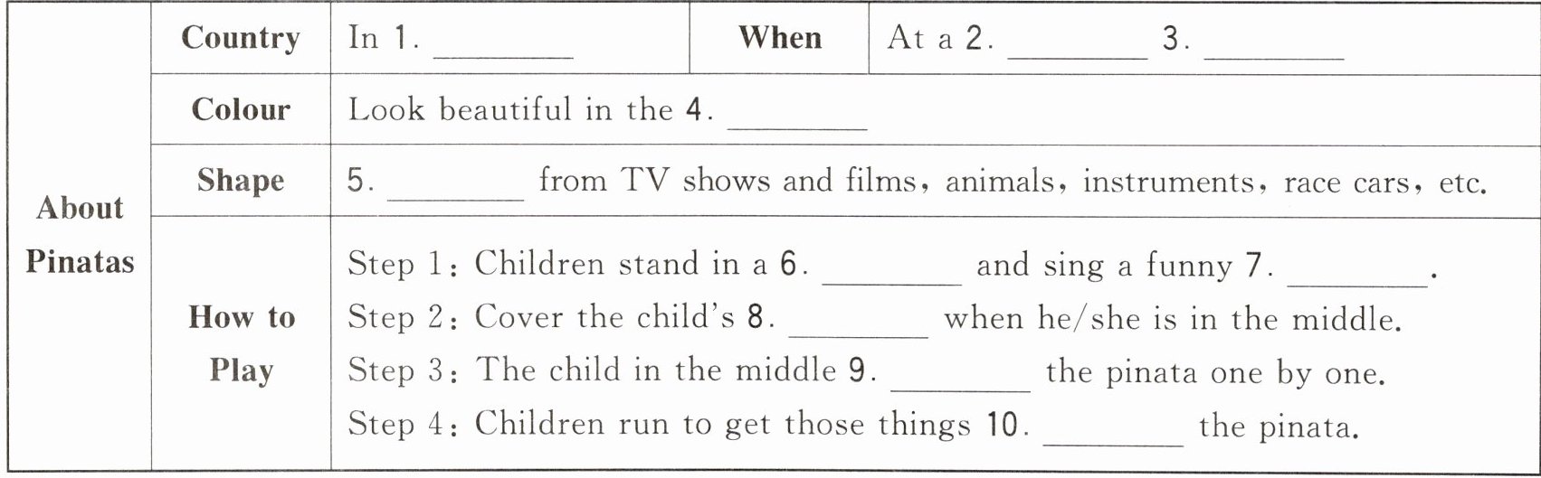 二、墨西哥的孩子们在生日派对上玩一种独特的游戏。阅读短文,补全表格。(每空一词)