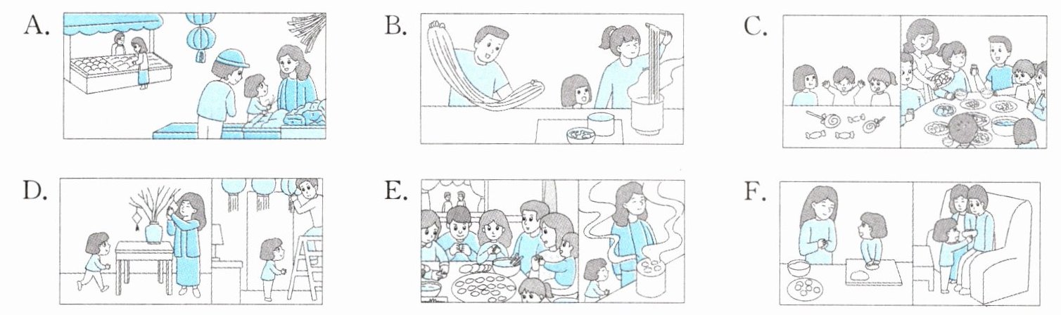 (E)我的妈妈和叔叔现在正在包饺子。“我能帮忙吗?”我问道。“你还是太小了,仁。我们很赶时间!”