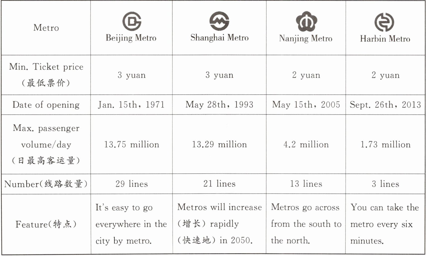 (答案:C)1. 从表格中,我们可以知道______的地铁是最新的。