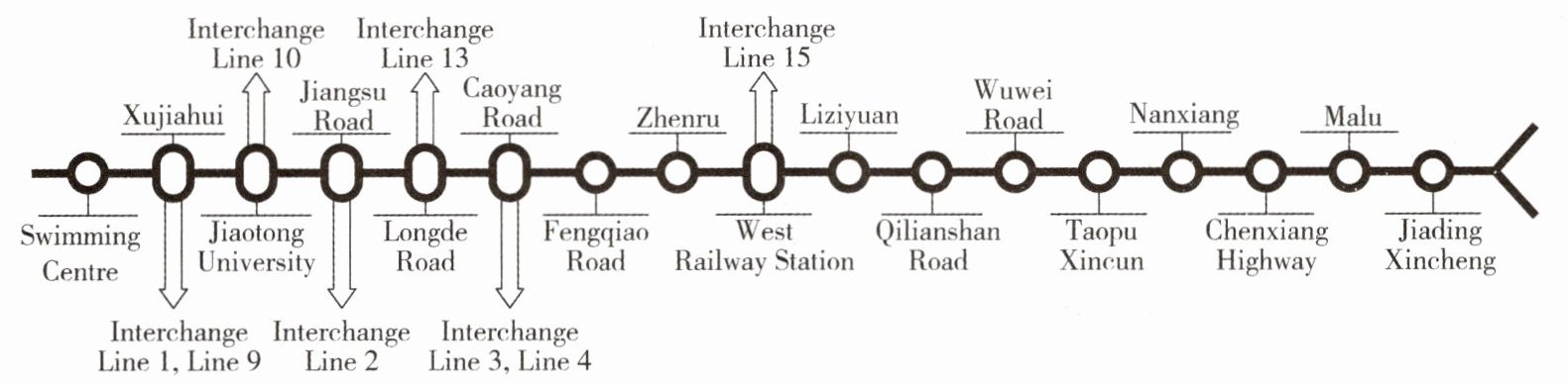 )4. You are at Zhenru Station. You want to go swimming. How many stops should you take?A. 5. B. 7. C. 9.
