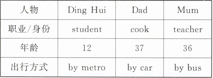 大家好。我的名字是丁辉。我有一个幸福的家庭。我家有三口人。他们是我的爸爸、我的妈妈和我。我的爸爸是一名厨师。他37岁。他在一家很不错的餐厅工作。他开车去上班。我的妈妈是一名教师。她36岁。她教语文。她坐公交车去上班。我是一名学生。我12岁。我坐地铁去上学。我们每天都很快乐!