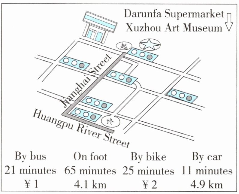 (B)2. 我们9:00从大润发超市出发,9:25到达徐州美术馆。我们去那里的方式可能是______。