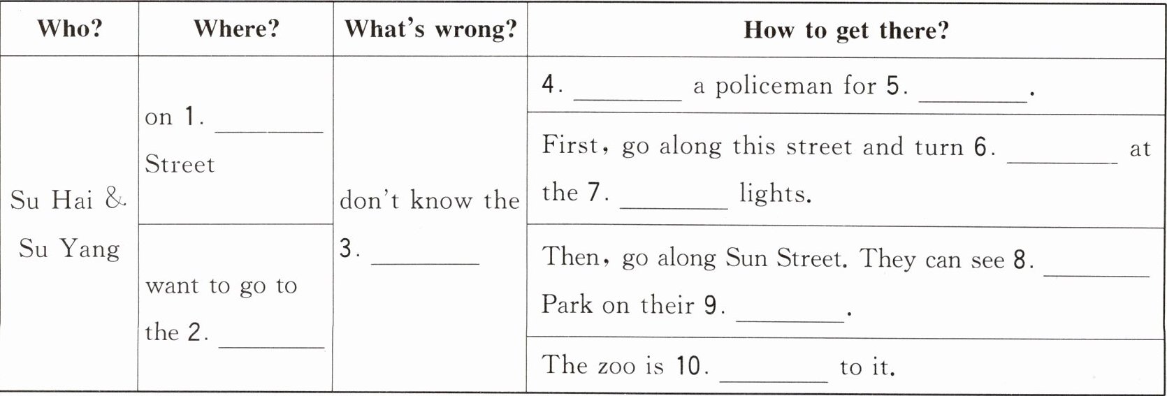 答案:1. Moon 2. cinema 3. way 4. Ask 5. help 6. right 7. traffic 8. City 9. left 10. next