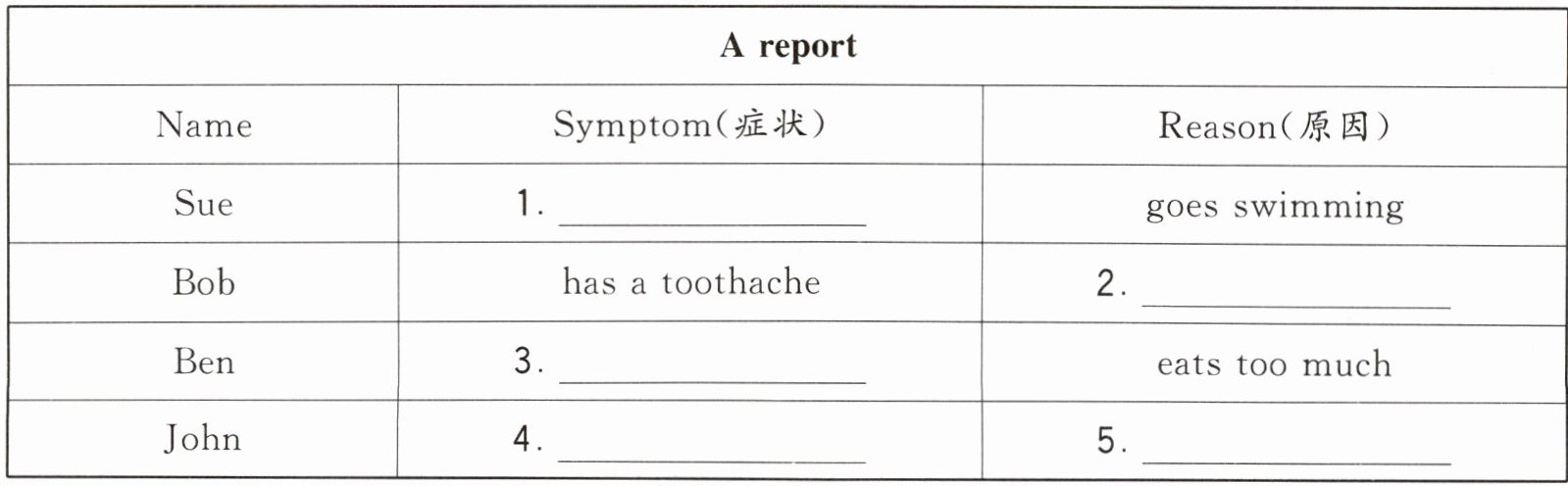 答案:四、1. has a fever 2. eats lots of sweets 3. has a stomachache 4. has a headache 5. has a cold