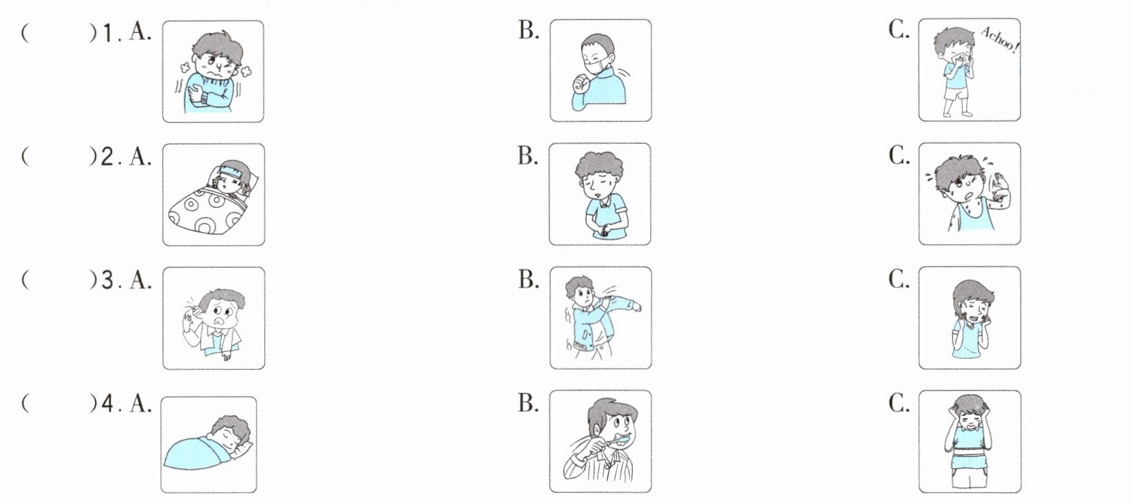 )3. What’s wrong with Sam?A. He has a cold. B. He has a headache. C. He has a toothache.