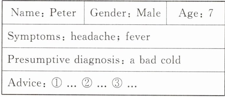 十二、读后续写 根据小彼得的问诊记录单,用英语写一段话描述他的情况,并给出建议。(5分)