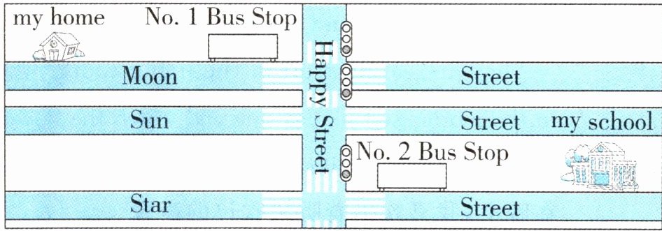 答案:I live on Moon Street. It is far from my school. I come to school by bus every day. First, I walk along Moon Street and take the bus at No.1 Bus Stop. The bus stop is near my home. Next, I get off the bus at No. 2 Bus Stop. It's on Star Street. Then, I go along Star Street and the school is on my left.