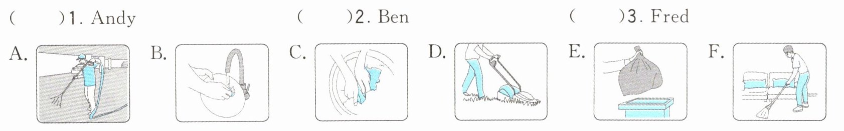 Andy draws first this weekend. He needs to clean the garage and clear away the rubbish. Ben has to mow the lawn and do the dishes. He is unhappy, because they are the longest jobs. Fred gets the jobs of sweeping the floor and washing clothes.