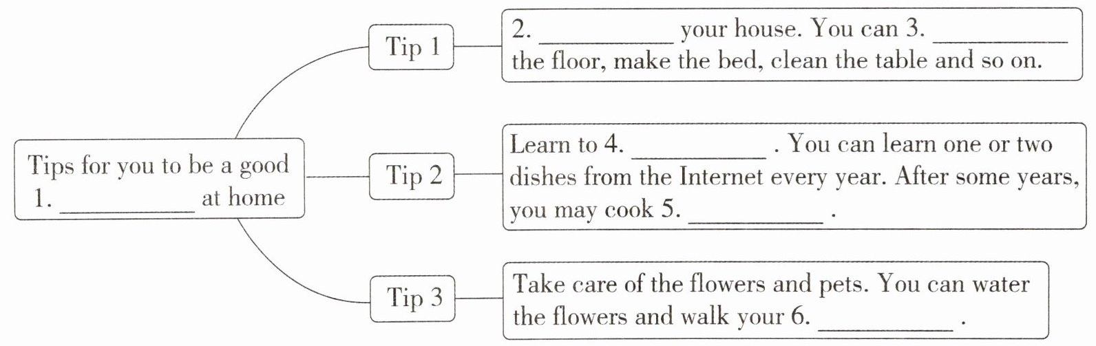 四、听录音,根据所听短文,填写单词完成思维导图,每空一词。(听三遍)