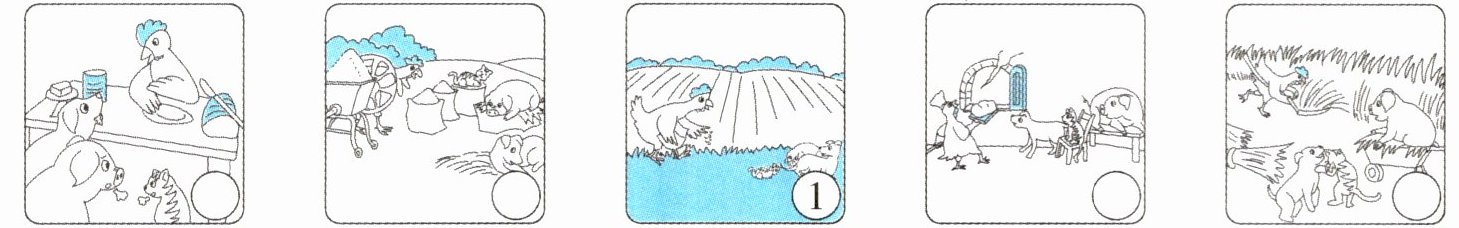 从前,有一只小红母鸡。小红母鸡1. 生活(C)在一个农场里,她有一些朋友——一只狗、一只贪睡的猫和一头猪。