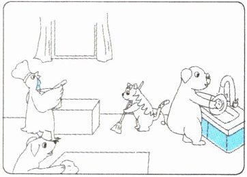 Little Red Hen and her friends are going to have a big lunch. Little Red Hen is cooking soup. It smells nice! The pig is washing the dishes. The dog is cleaning the table. The cat is sweeping the floor. Everyone is busy but happy.