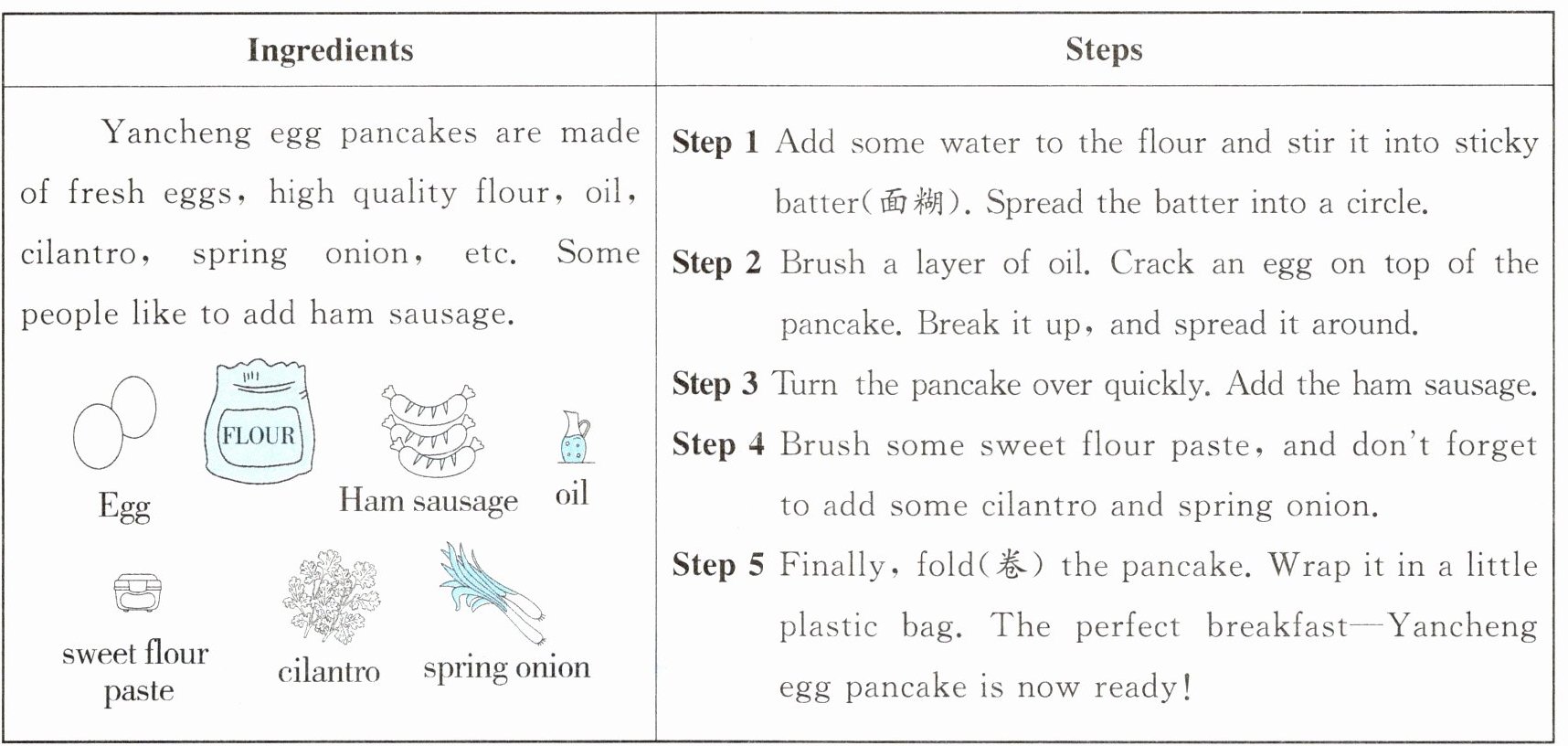 )2. What don't we need when we make egg pancakes?A. Beef.
