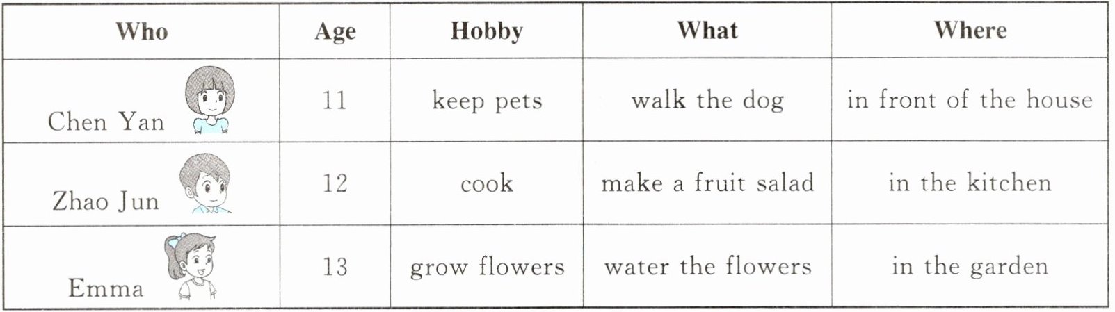 陈燕11岁。她喜欢养宠物。看!她正在房子前面遛狗。赵军12岁。他喜欢烹饪。看!他正在厨房里做水果沙拉。艾玛13岁。她喜欢种花。她现在正在花园里浇花。