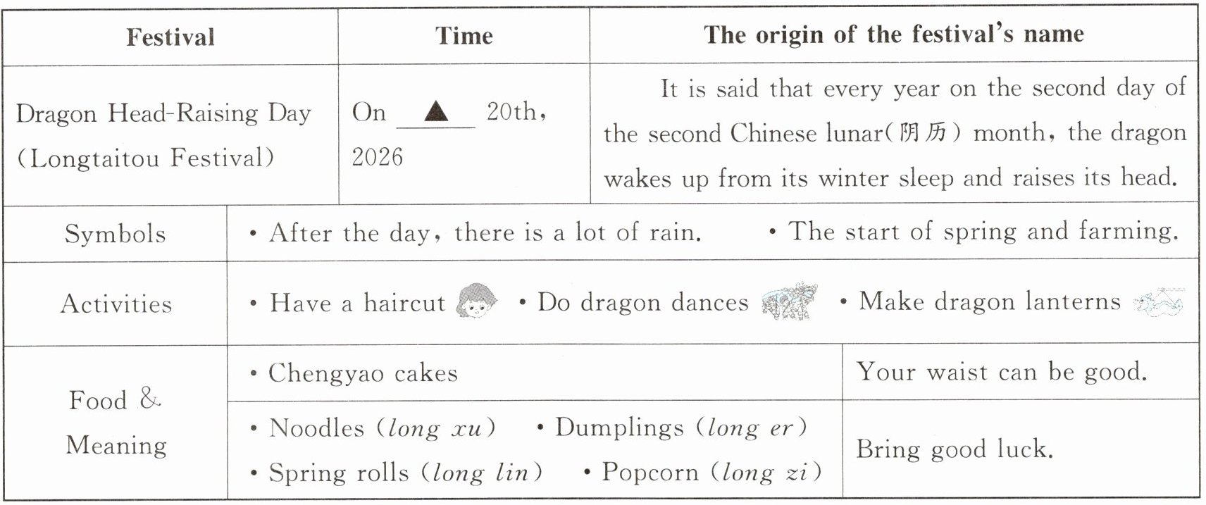 )1. The Lantern Festival is on March 3rd of 2026. When is the Longtaitou Festival?A. On January 20th, 2026.