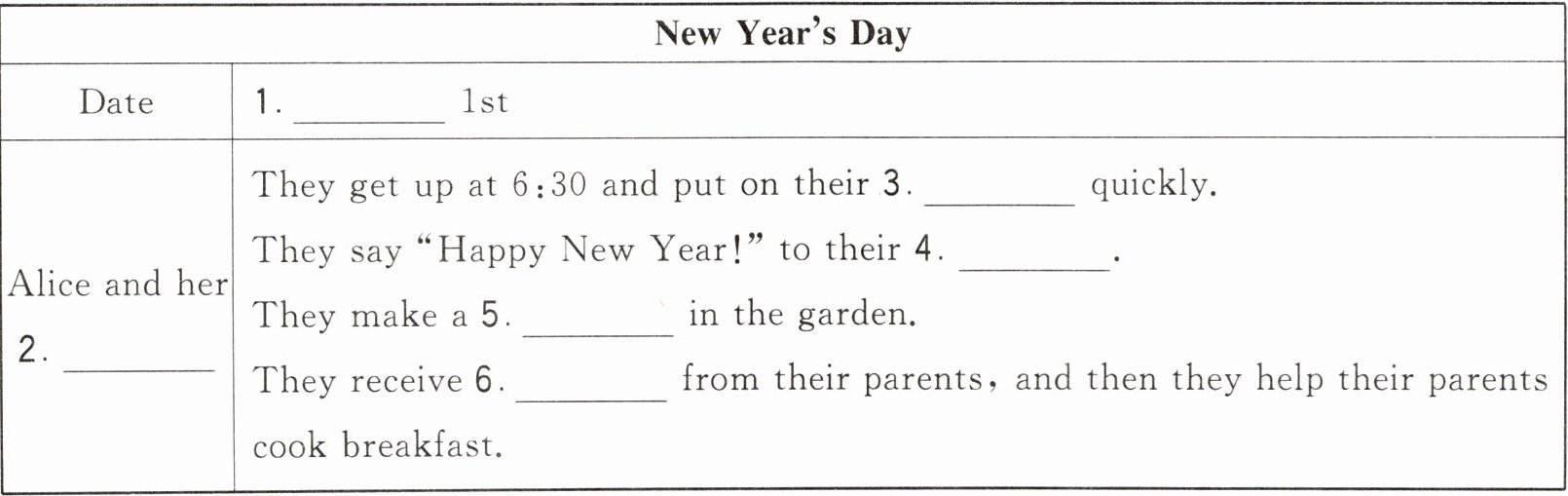 答案:五、1. January 2. brother 3. clothes 4. parents 5. snowman 6. presents