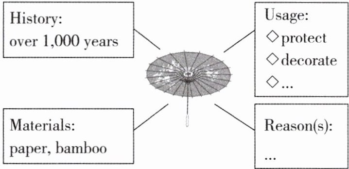 本题要求学生作为“推荐官”推荐中国传统工艺品——纸伞。根据提示,学生需要介绍历史、用法、材料、推荐理由,且主要使用一般现在时。