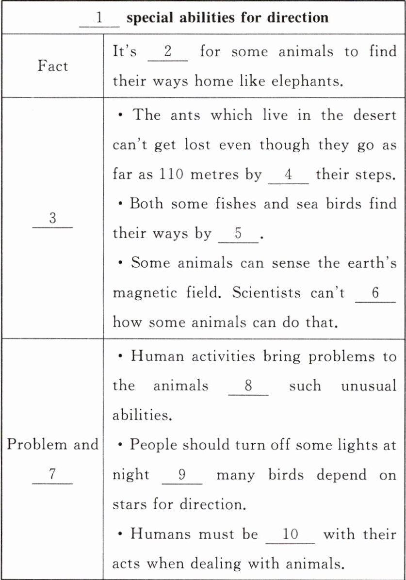 1. Animals' 解析:根据短文主题“一些动物具有特殊的方向感能力”,可知此处指“动物的”特殊能力,应用名词所有格,故填 Animals'。