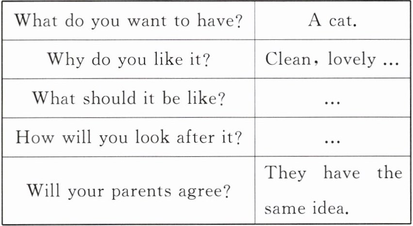 思路梳理题目要求是根据表格内容写一篇表达你对宠物意愿和想法的作文,要求包含所有提示内容,可适当发挥。本文主要用第一人称来叙述,时态主要是一般现在时,用将来时描述以后有了宠物猫的场景。保证表格内容叙述完整,条理清晰,可适当扩充内容使文章更丰富。