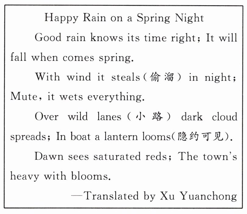 答案:1. A 解析:拟人修辞是将事物赋予人的动作或情感。选项 A“With wind it steals in night.”中“steal”(偷溜)是人的动作,运用了拟人,故选 A。