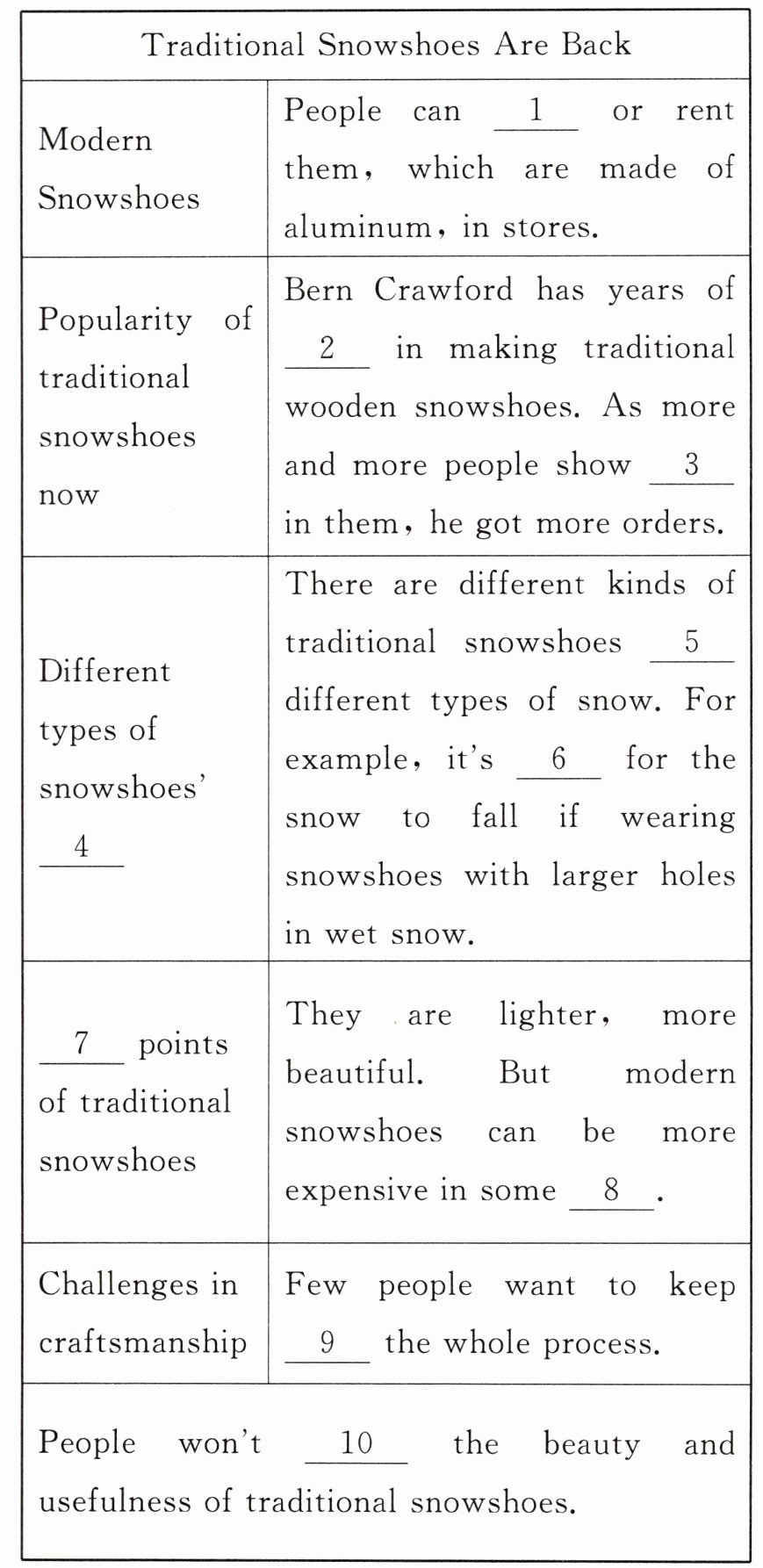 10. forget 解析:根据原文“the growing interest in using them shows that their beauty and usefulness will not be forgotten”可知人们不会忘记传统雪鞋的美和用处,“will not be forgotten”对应“won't forget”,符合语境。
