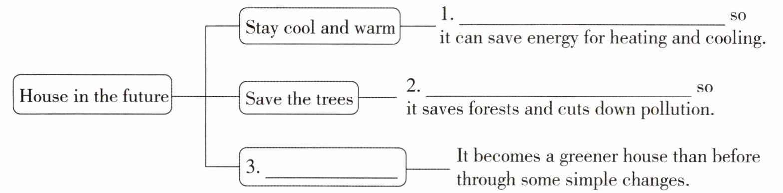 ③I want a green house that is not only good for the environment,but also healthier for the people inside. And I don’t need to build a whole new building. I will make some simple changes to the old house like planting trees and covering the house with solar panels(太阳能板).