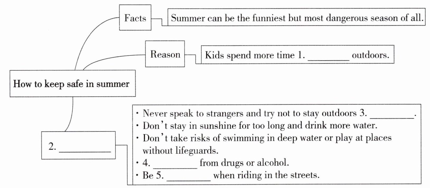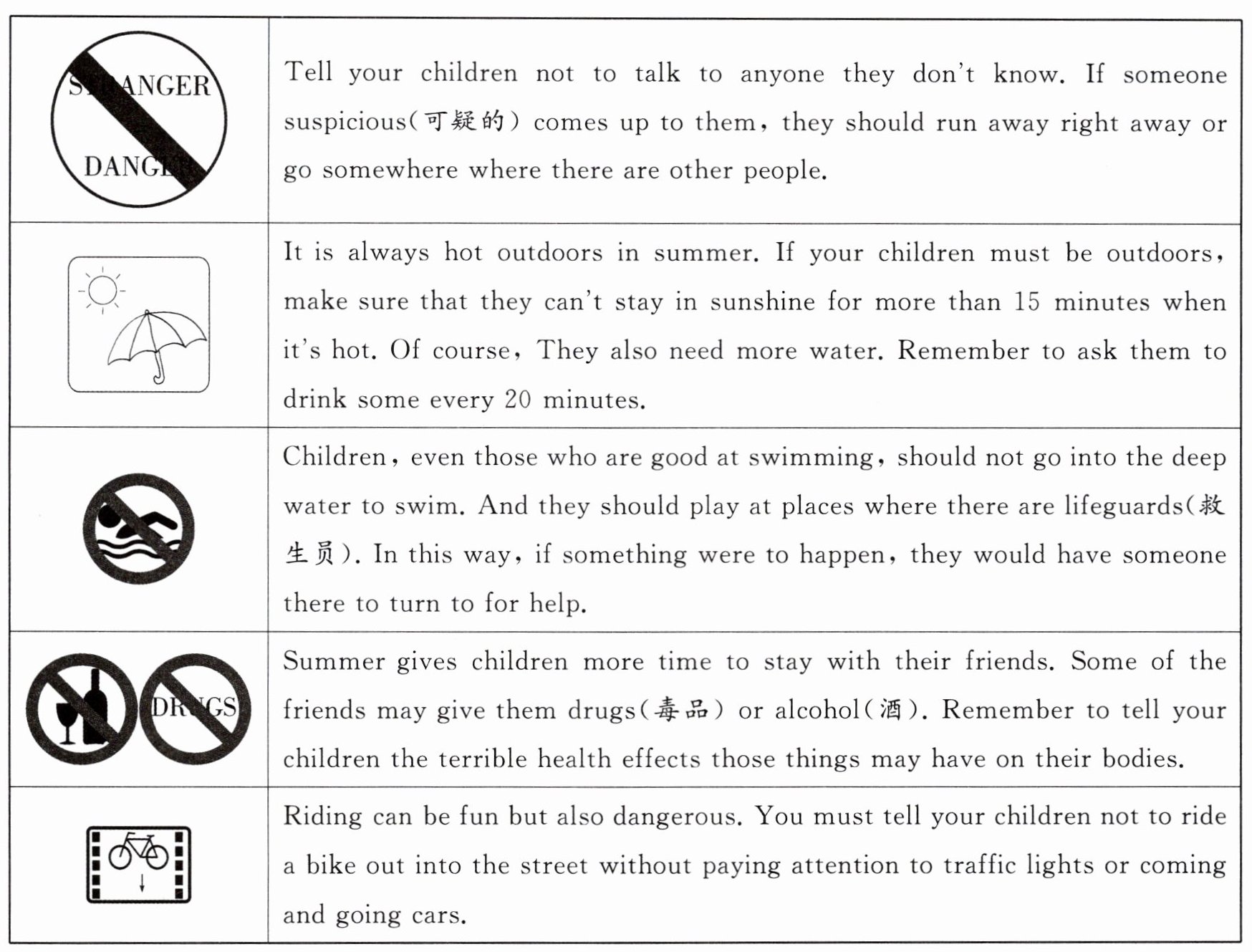 答案:【语篇解读】本文是一篇应用文,主要介绍了在夏天如何保证孩子们的安全。