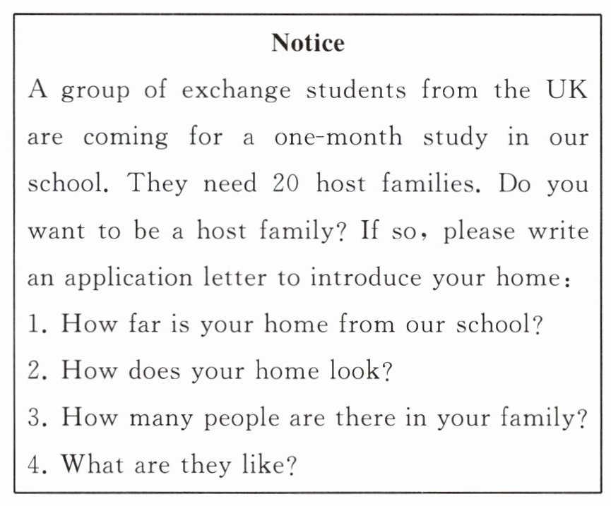 答案:Dear Sir or Madam, My name is Li Hua, a Grade 7 student. I would like to apply to become one of the host families for the exchange students. My home is close to our school. It takes only 15 minutes to walk there, so the exchange student can get to school easily. Our house is a two-story building with a small yard. There are many green plants and a big tree in the yard, where we can sit and relax. There are three people in my family: my father, my mother, and me. My father is a doctor. He is very friendly and always ready to help others. My mother is a teacher. She is patient and good at cooking delicious food. I am an outgoing boy and I like making friends. We are all excited to welcome the exchange student and believe we can make him/her feel at home. Yours, Li Hua