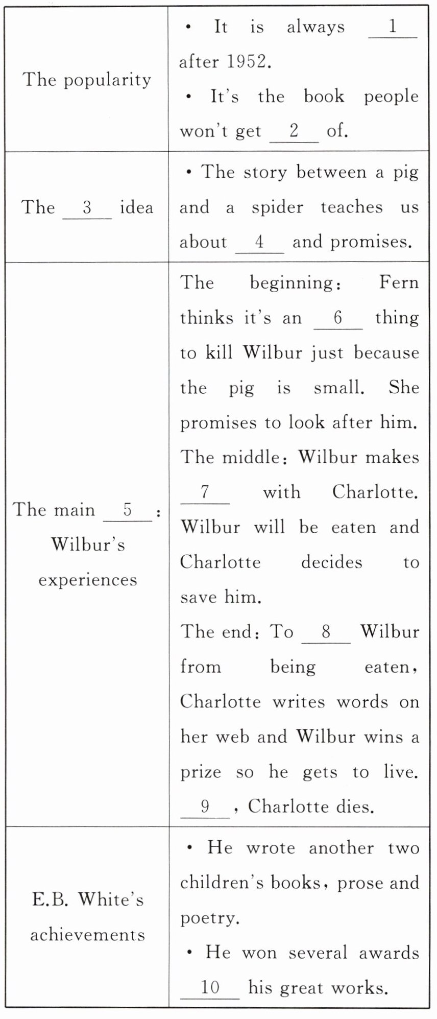 7. friends 解析: 根据原文“There he meets his best friend in life, Charlotte the spider.”(Wilbur 和 Charlotte 成为朋友),“make friends”为固定搭配,故填“friends”。